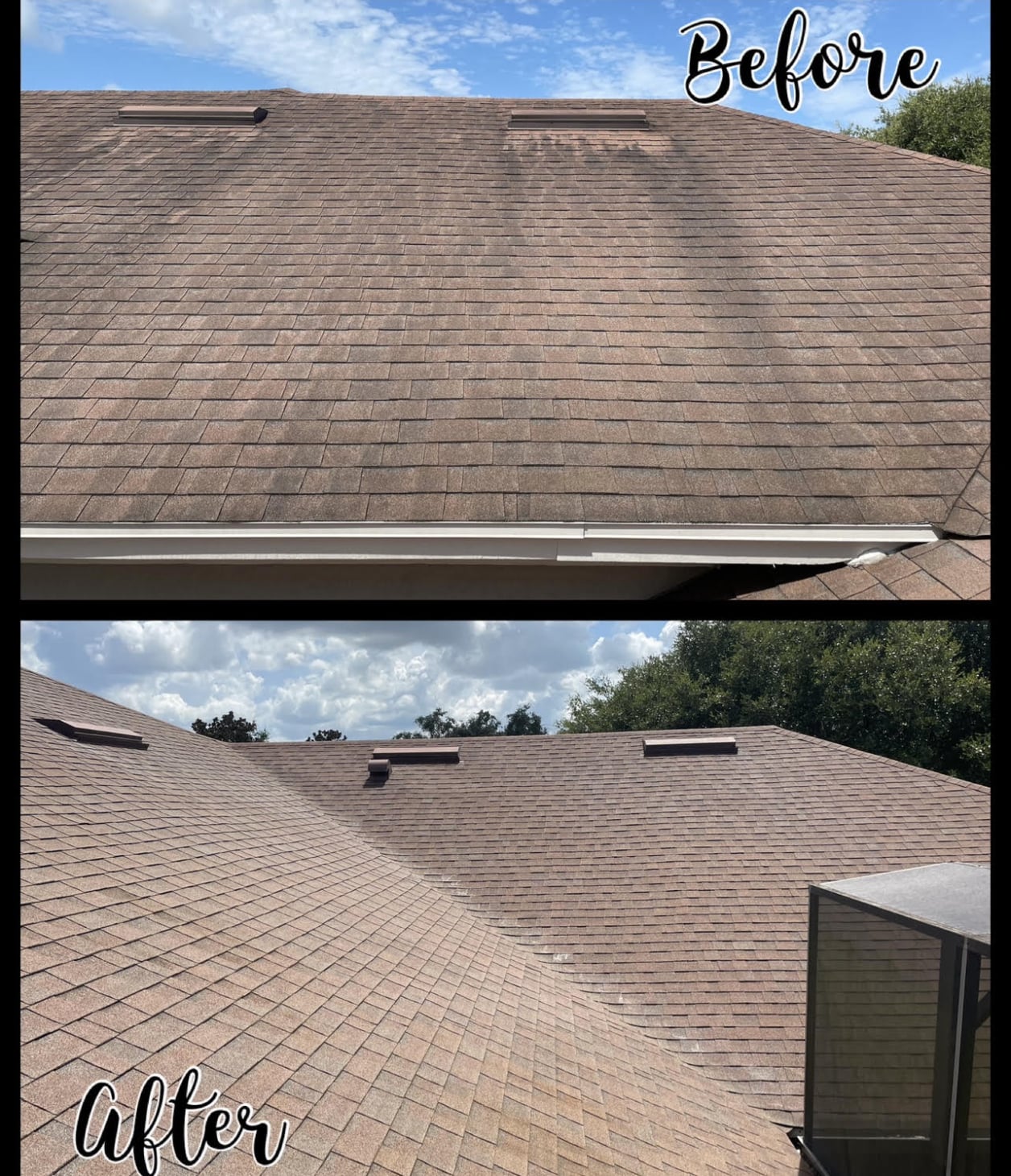 Our roof cleaning process involves a light sweep of large moss, and a blowoff of loose debris.